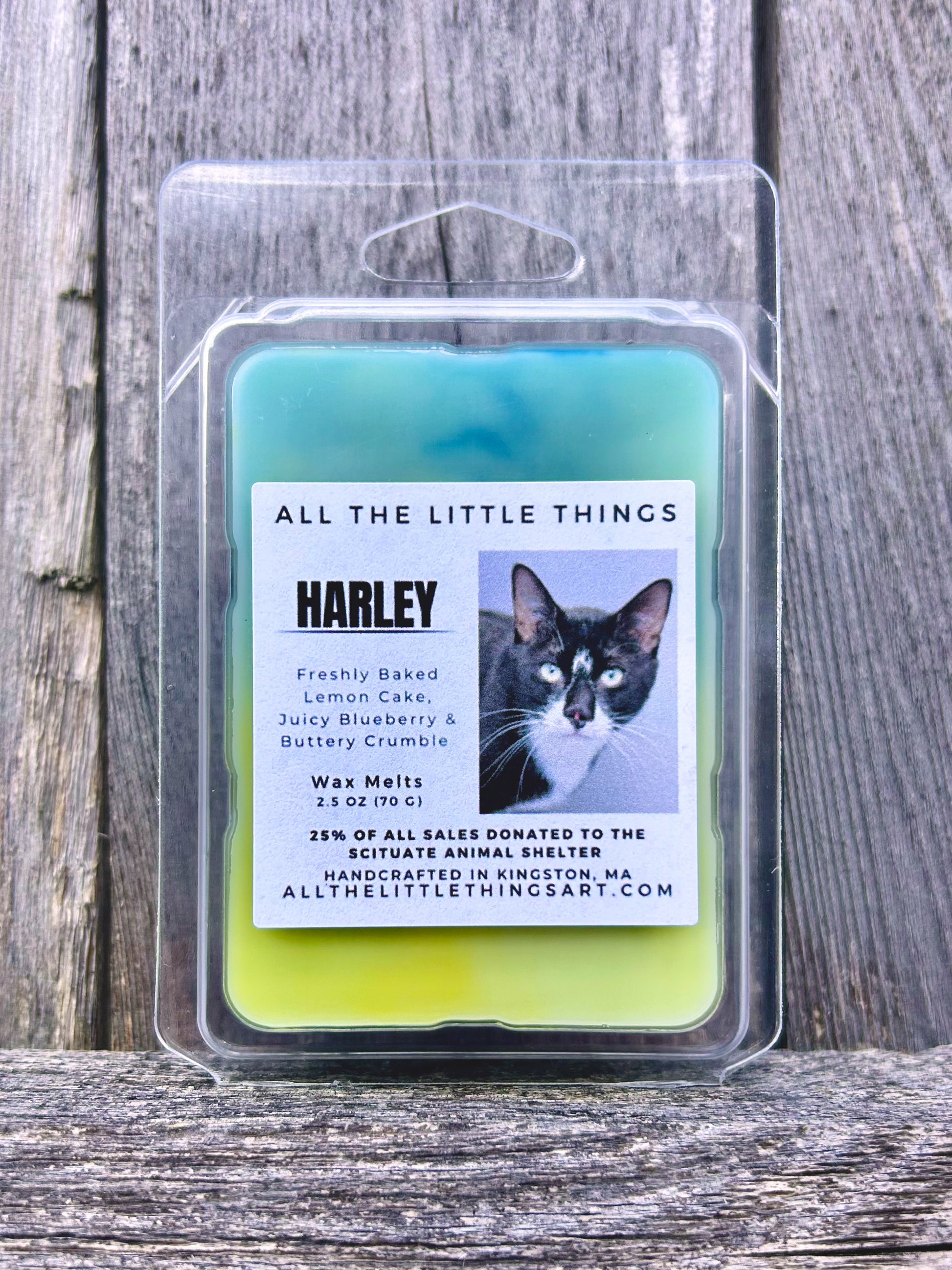 Harley’s scent is a blend of Freshly Baked Lemon Cake, Juicy Blueberry & Buttery Crumble.